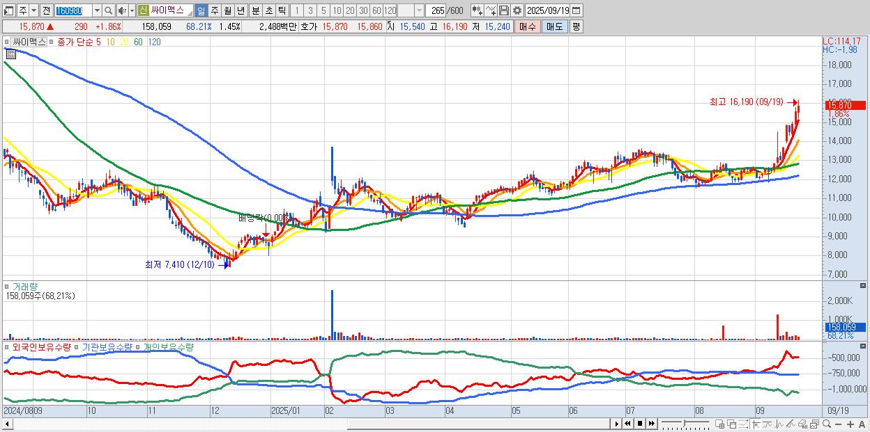 - 싸이맥스 (15,870원 ▲ 1.86% , 시총: 1,734억, 거래량: 158,059, 거래대금:25억, KOSDAQ)