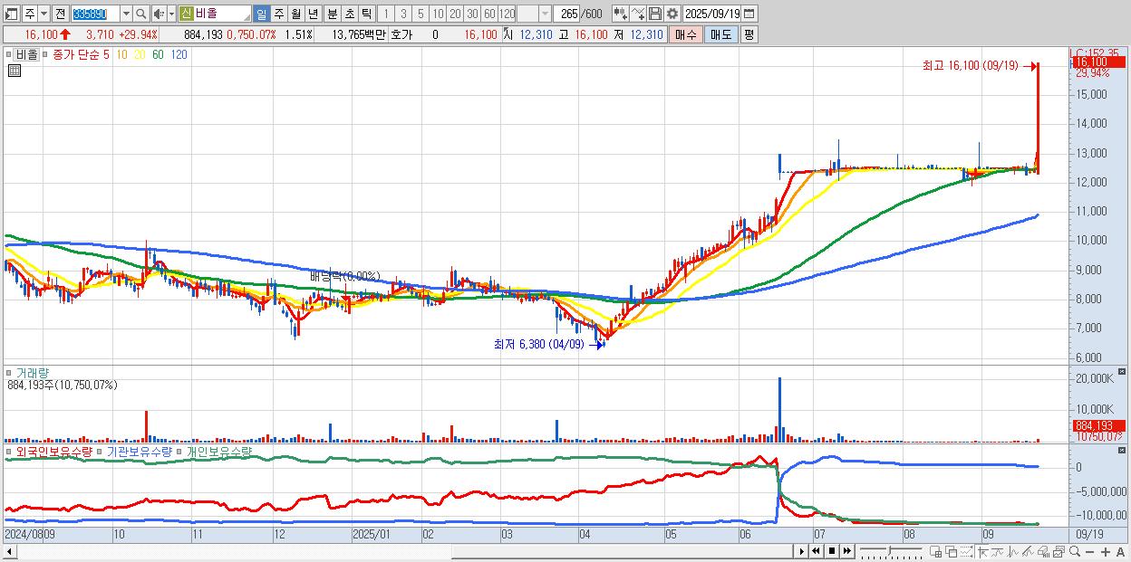 - 비올 (16,100원 ▲ 29.94% , 시총: 9,405억, 거래량: 884,193, 거래대금:138억, KOSDAQ)