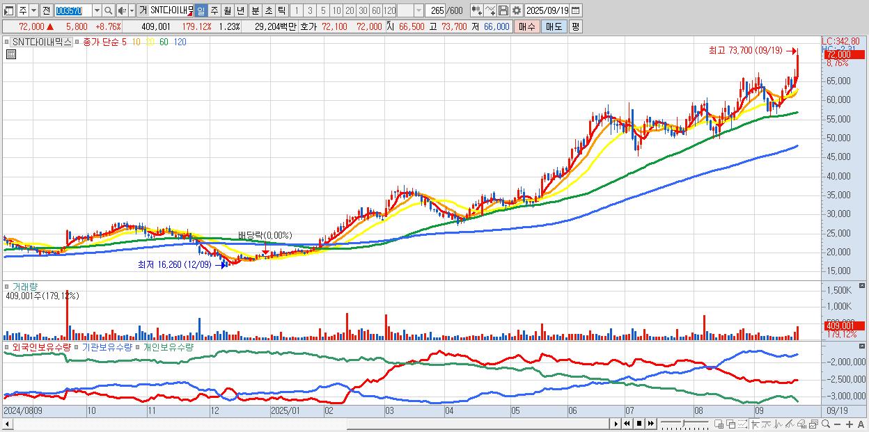 - SNT다이내믹스 (71,300원 ▲ 7.7% , 시총: 23,709억, 거래량: 329,200, 거래대금:235억, KOSPI)