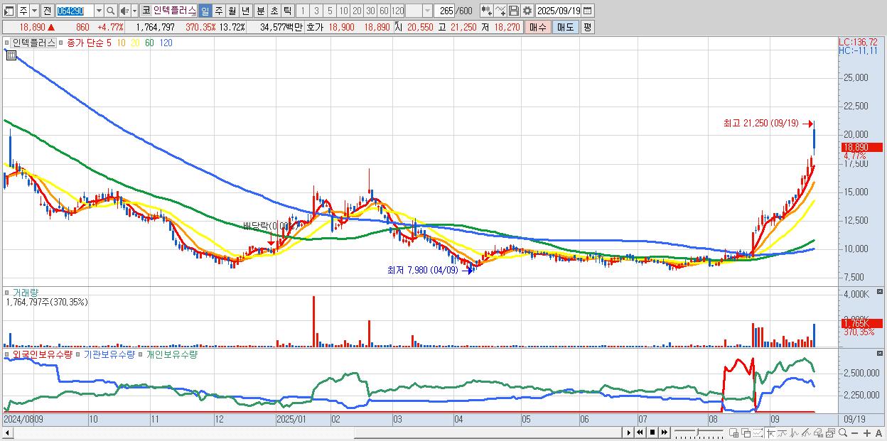 - 인텍플러스 (18,890원 ▲ 4.77% , 시총: 2,430억, 거래량: 1,764,797, 거래대금:346억, KOSDAQ)