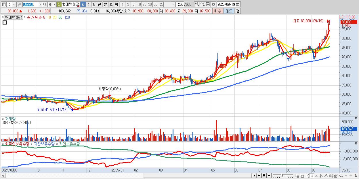 - 현대백화점 (89,400원 ▲ 2.52% , 시총: 20,230억, 거래량: 139,542, 거래대금:124억, KOSPI)