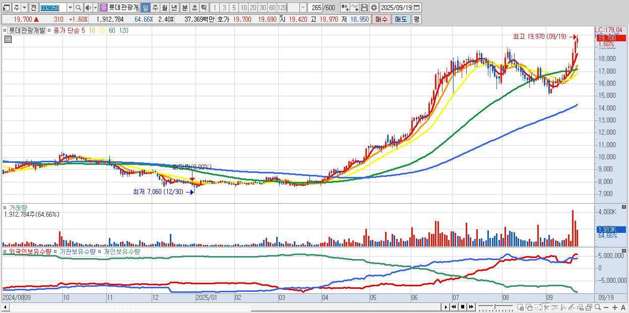 - 롯데관광개발 (19,700원 ▲ 1.6% , 시총: 15,669억, 거래량: 1,912,784, 거래대금:374억, KOSPI)