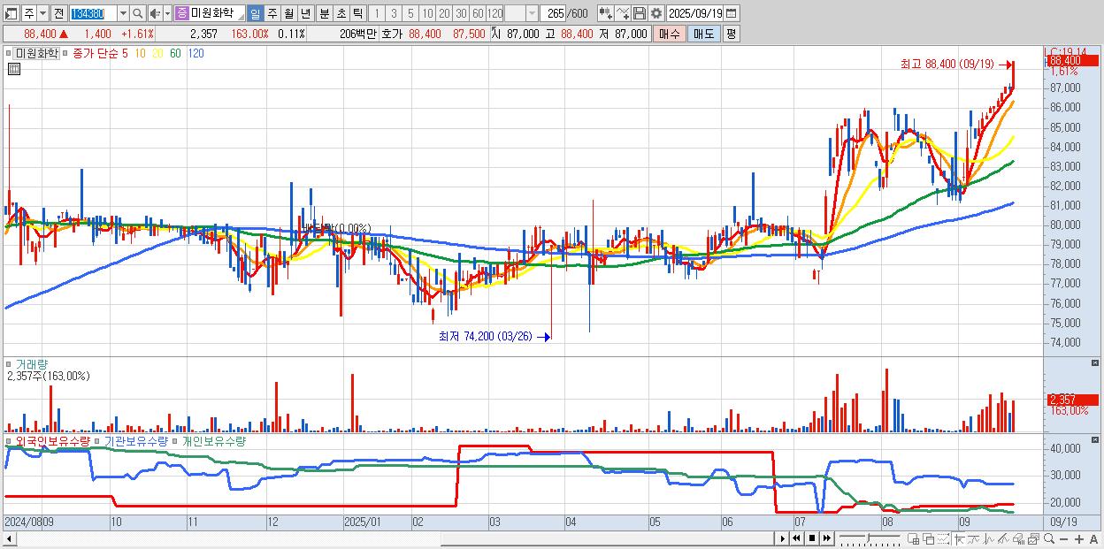 - 미원화학 (88,400원 ▲ 1.61% , 시총: 1,944억, 거래량: 2,357, 거래대금:2억, KOSPI)