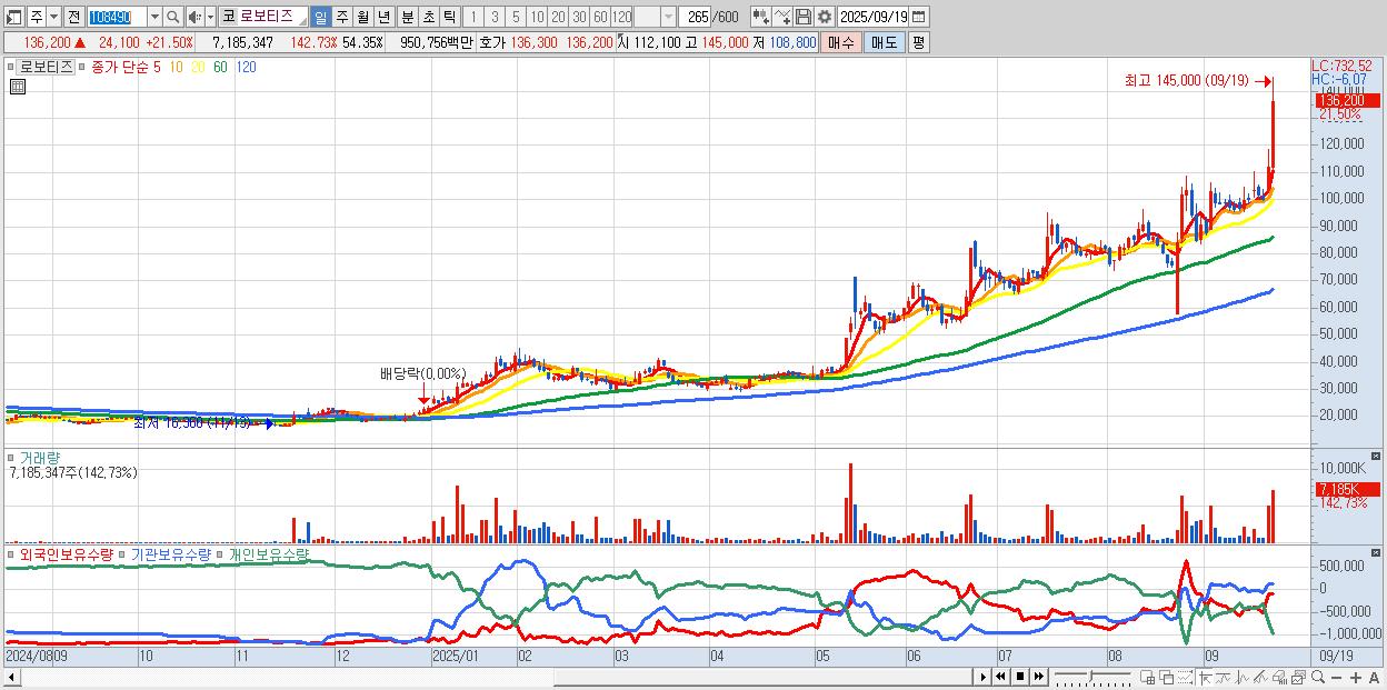 - 로보티즈 (136,200원 ▲ 21.5% , 시총: 18,006억, 거래량: 7,185,347, 거래대금:9,508억, KOSDAQ)