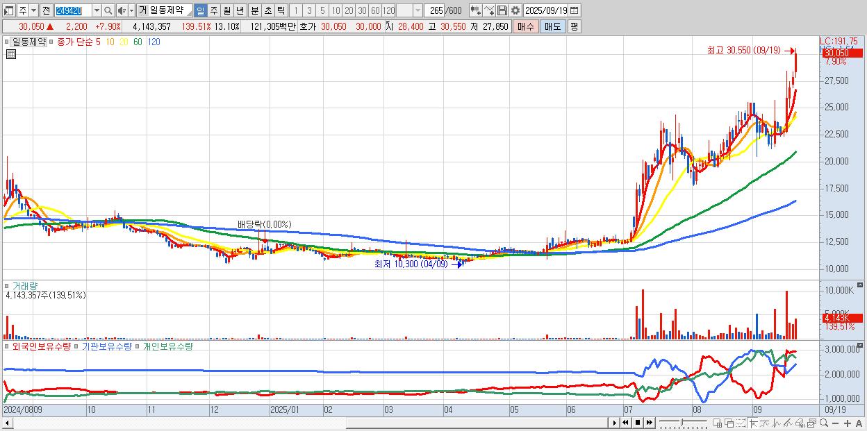 - 일동제약 (30,050원 ▲ 7.9% , 시총: 9,507억, 거래량: 4,143,357, 거래대금:1,213억, KOSPI)