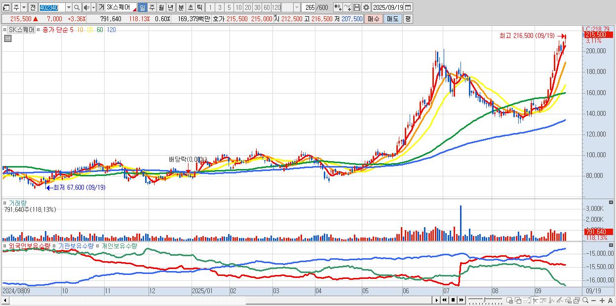 - SK스퀘어 (216,500원 ▲ 3.84% , 시총: 286,951억, 거래량: 733,301, 거래대금:1,570억, KOSPI)