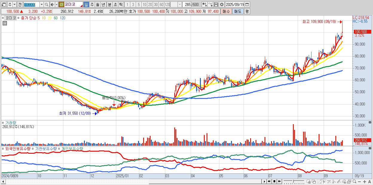 - 코미코 (101,300원 ▲ 4.11% , 시총: 10,597억, 거래량: 150,137, 거래대금:150억, KOSDAQ)