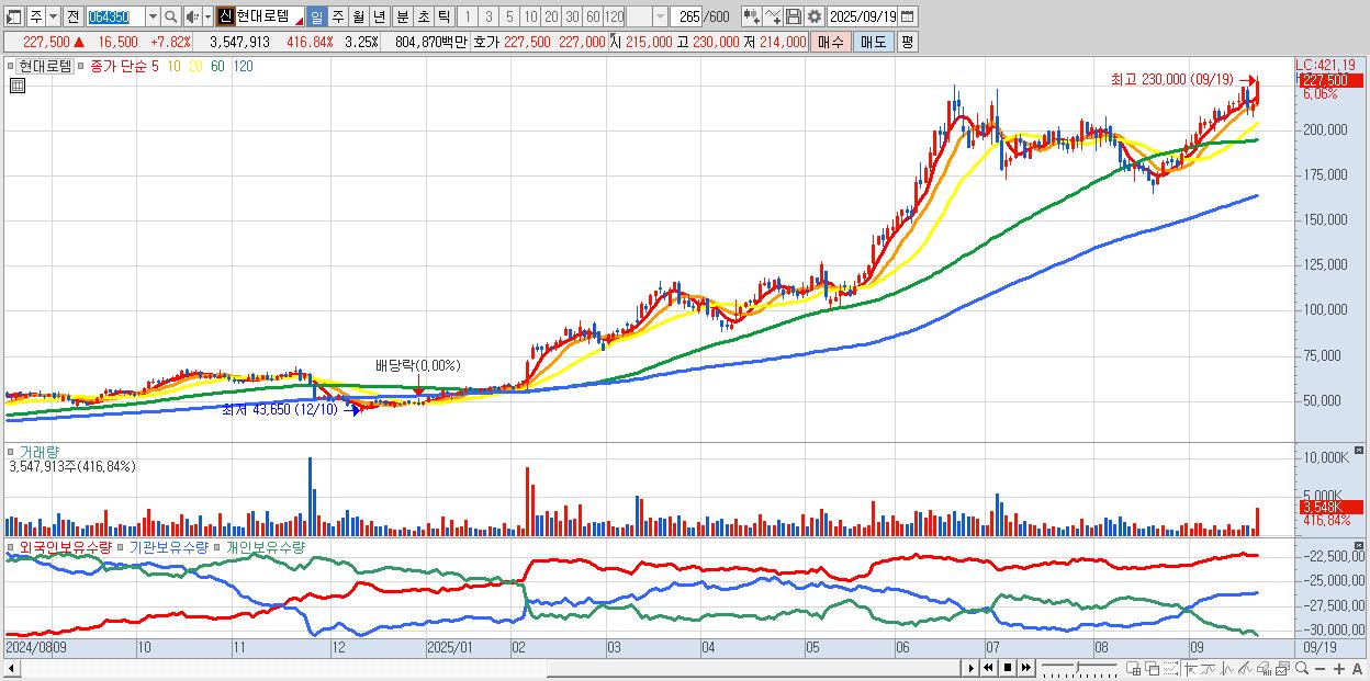 - 현대로템 (230,000원 ▲ 9% , 시총: 251,027억, 거래량: 2,629,924, 거래대금:5,991억, KOSPI)