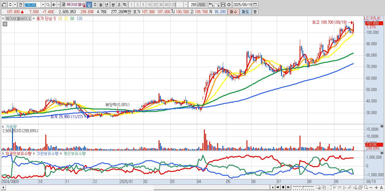 - 에이비엘바이오 (108,300원 ▲ 7.98% , 시총: 59,105억, 거래량: 1,602,856, 거래대금:1,706억, KOSDAQ)