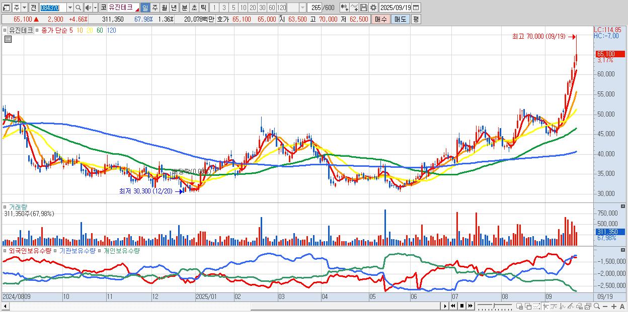 - 유진테크 (64,700원 ▲ 4.02% , 시총: 14,827억, 거래량: 216,139, 거래대금:139억, KOSDAQ)