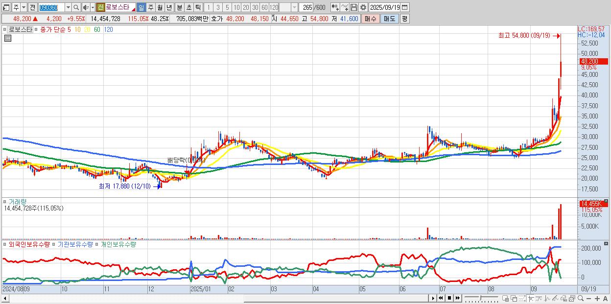 - 로보스타 (48,300원 ▲ 9.77% , 시총: 4,709억, 거래량: 6,361,546, 거래대금:3,123억, KOSDAQ)