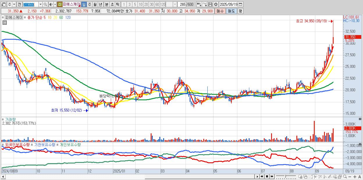 - 피에스케이 (31,100원 ▲ 6.51% , 시총: 9,009억, 거래량: 1,286,980, 거래대금:402억, KOSDAQ)