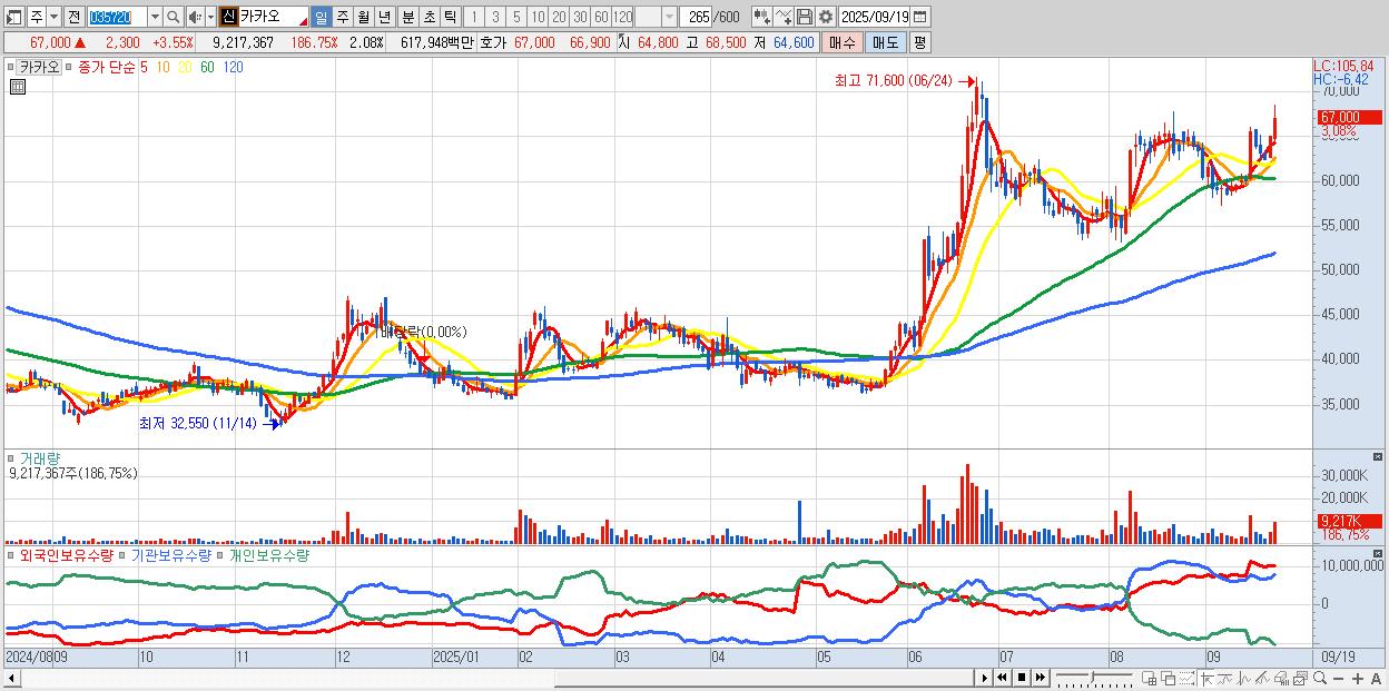 - 카카오 (67,000원 ▲ 3.55% , 시총: 296,325억, 거래량: 5,009,911, 거래대금:3,361억)