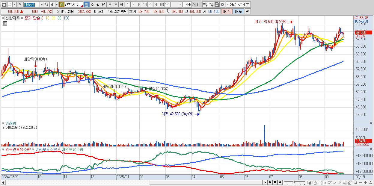 - 신한지주 (69,800원 ▲ 1.16% , 시총: 338,875억, 거래량: 2,749,337, 거래대금:1,915억)