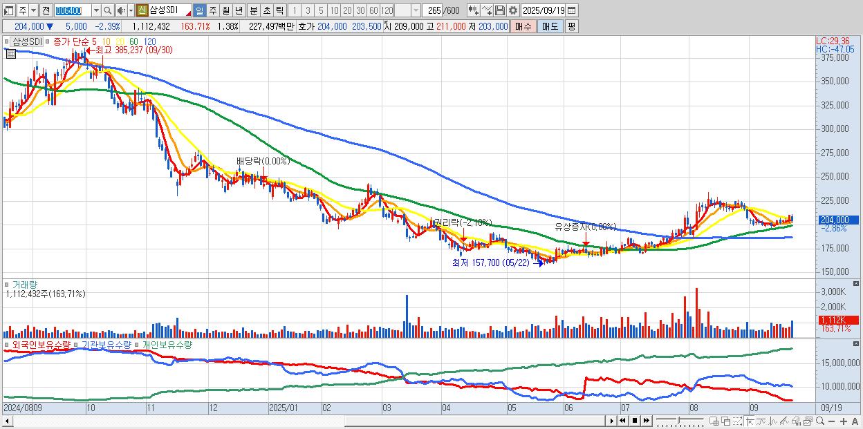 - 삼성SDI (203,000원 ▼ -2.87% , 시총: 163,589억, 거래량: 858,121, 거래대금:1,751억)