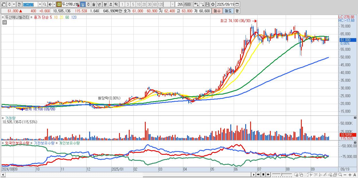 - 두산에너빌리티 (60,800원 ▲ 0.33% , 시총: 389,461억, 거래량: 4,819,288, 거래대금:2,965억)
