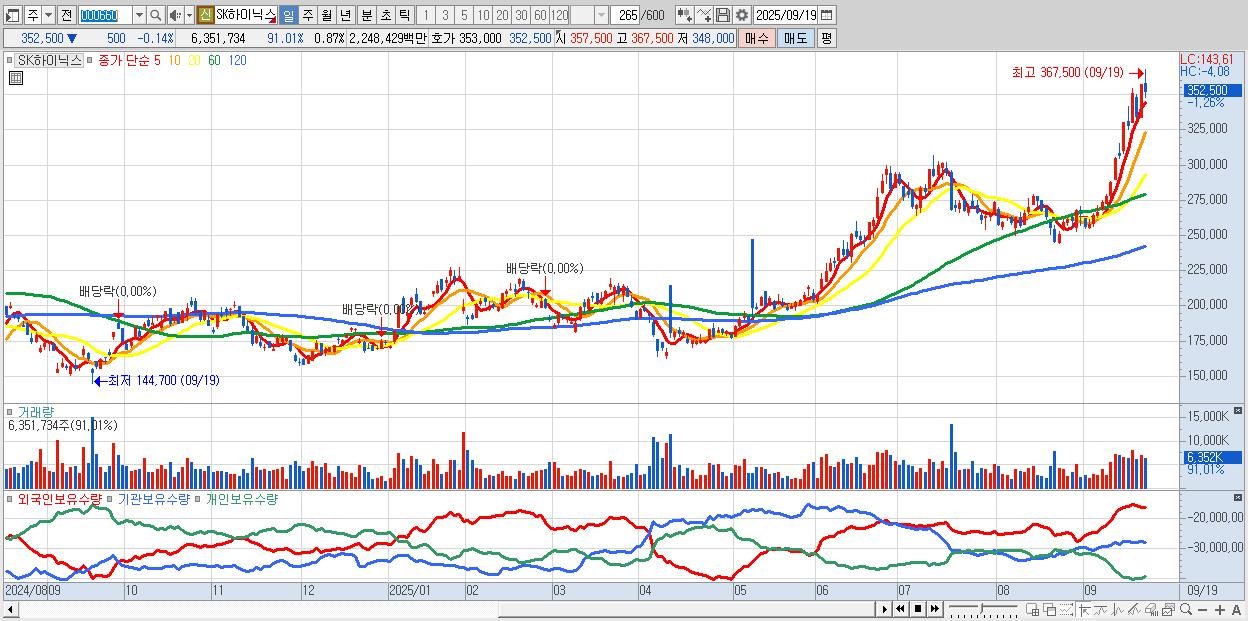 - SK하이닉스 (353,000원 0% , 시총: 2,569,848억, 거래량: 4,385,543, 거래대금:15,461억)