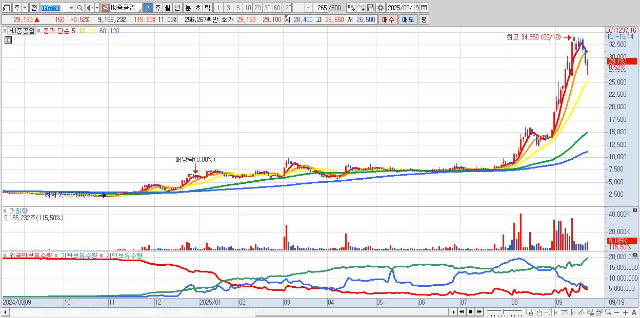 - HJ중공업 (29,150원 ▲ 0.52% , 시총: 24,274억, 거래량: 9,185,232, 거래대금:2,563억)