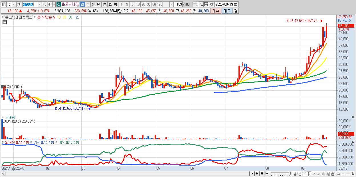 - 온코닉테라퓨틱스 (45,100원 ▲ 10.67% , 시총: 4,990억, 거래량: 3,834,128, 거래대금:1,686억)