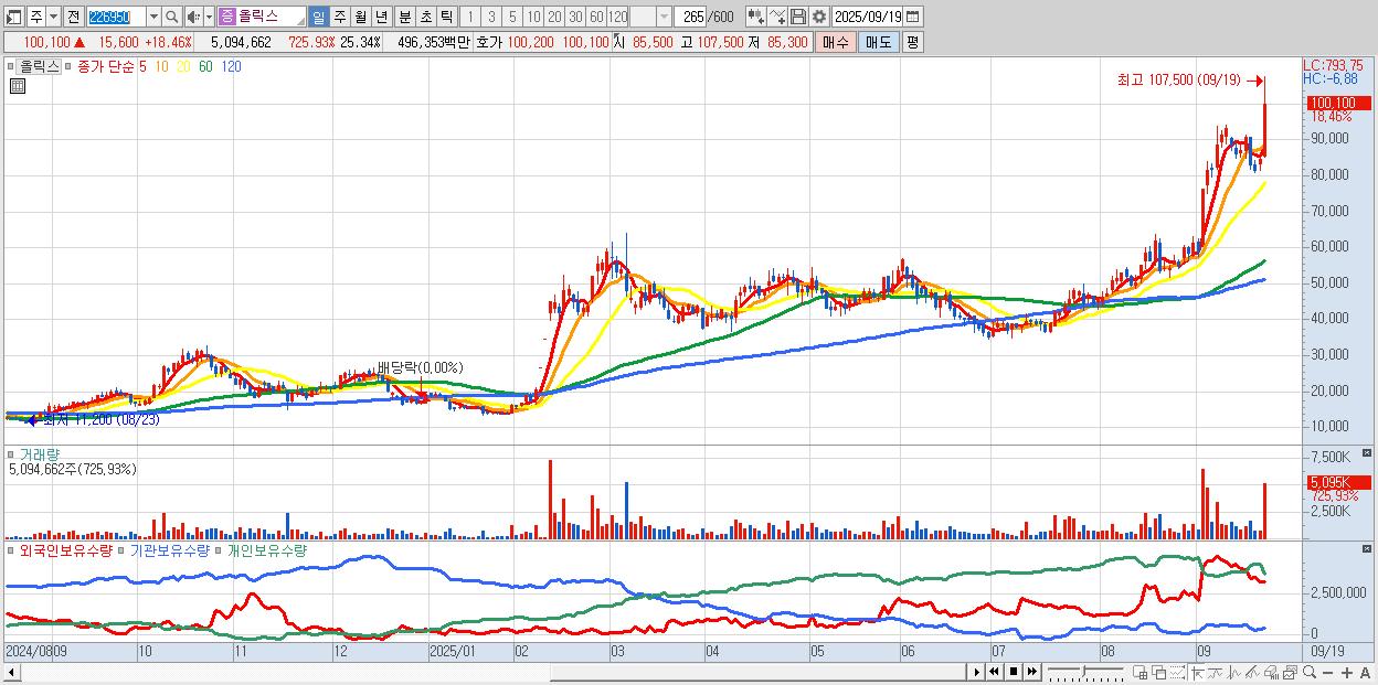 - 올릭스 (100,100원 ▲ 18.46% , 시총: 20,127억, 거래량: 5,094,662, 거래대금:4,964억)