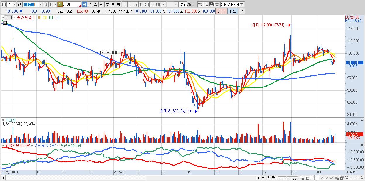 - 기아 (101,600원 ▼ -0.49% , 시총: 400,090억, 거래량: 1,545,375, 거래대금:1,565억)