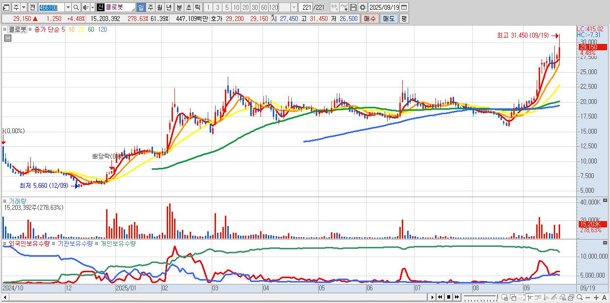 - 클로봇 (29,150원 ▲ 4.48% , 시총: 7,219억, 거래량: 15,203,392, 거래대금:4,471억)