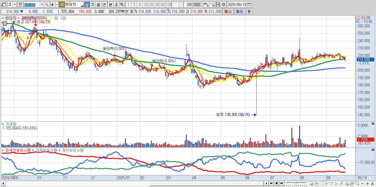 - 현대차 (214,000원 ▼ -2.06% , 시총: 438,182억, 거래량: 1,301,527, 거래대금:2,784억)
