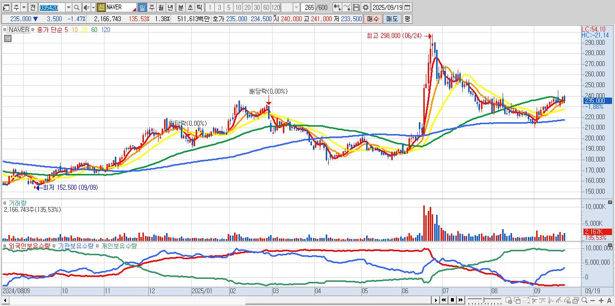 - NAVER (234,000원 ▼ -1.89% , 시총: 367,035억, 거래량: 1,585,243, 거래대금:3,737억)