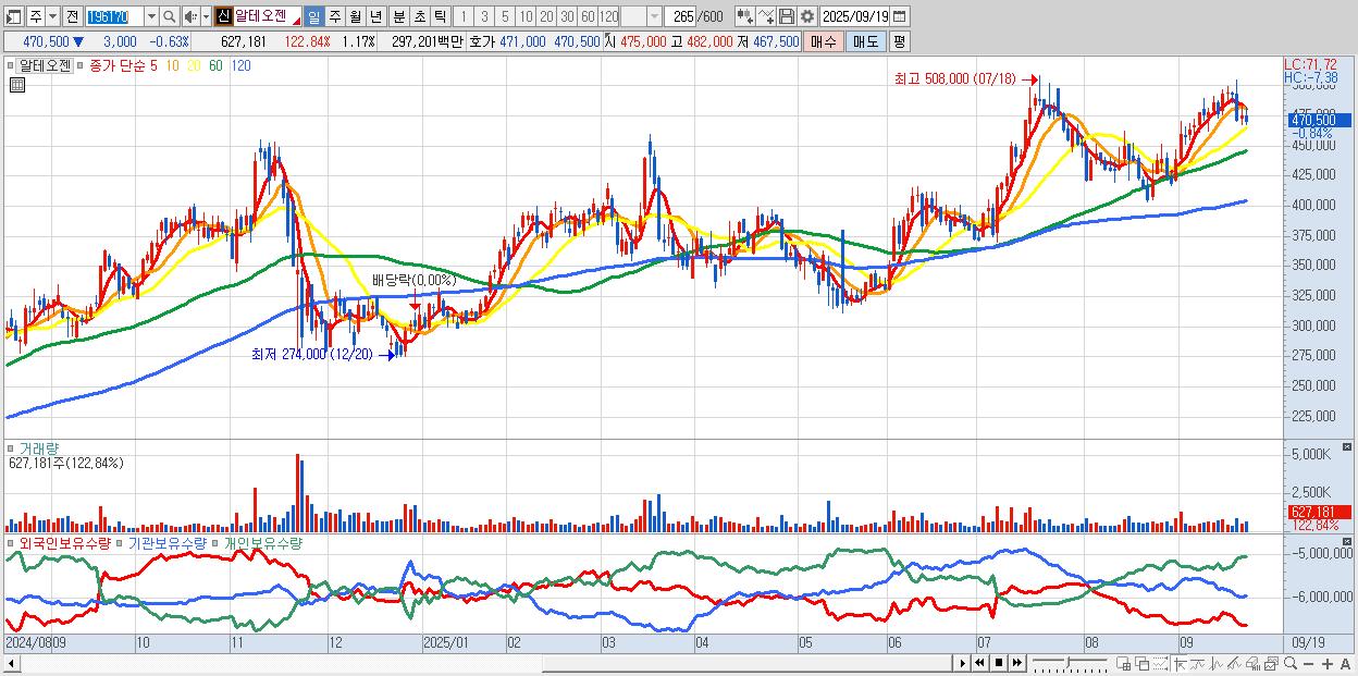 - 알테오젠 (472,500원 ▼ -0.21% , 시총: 252,622억, 거래량: 365,957, 거래대금:1,735억)