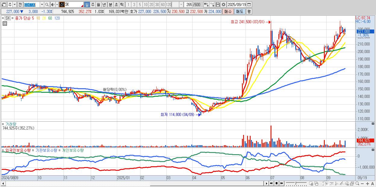 - SK (227,000원 ▼ -1.3% , 시총: 164,581억, 거래량: 680,127, 거래대금:1,543억)