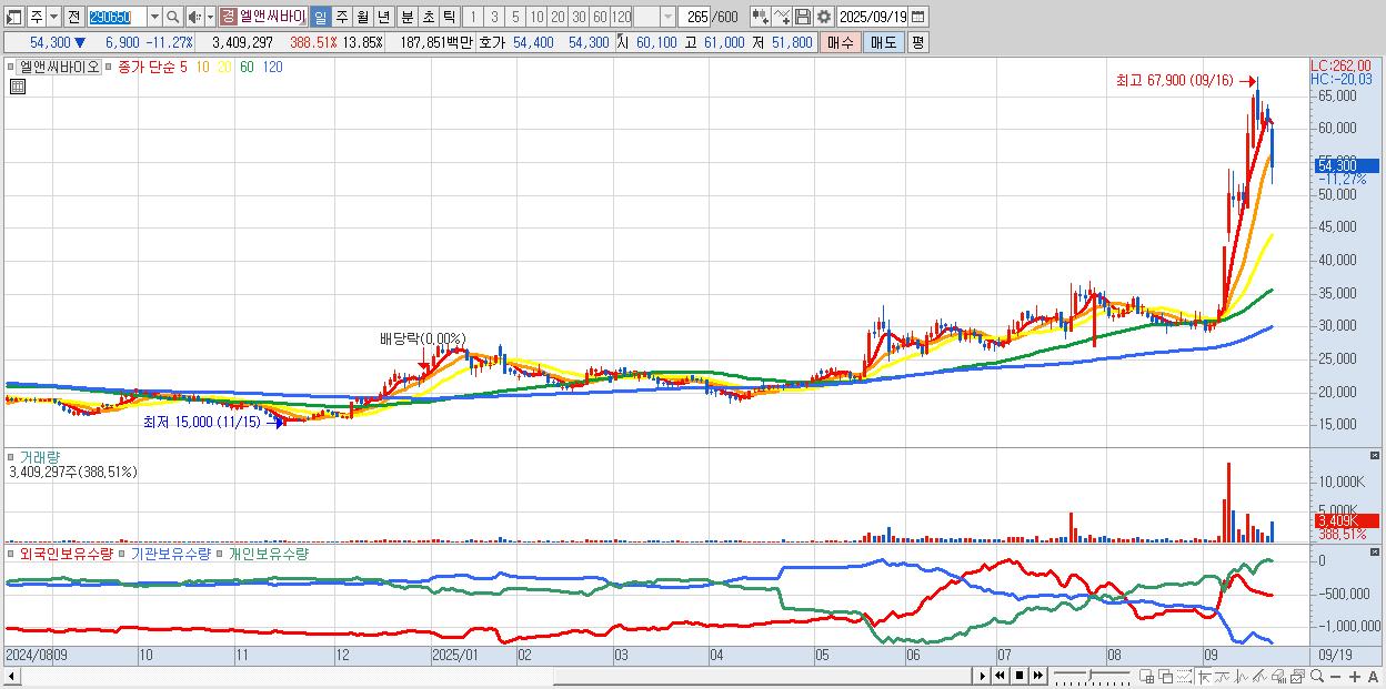 - 엘앤씨바이오 (54,300원 ▼ -11.27% , 시총: 13,368억, 거래량: 3,409,297, 거래대금:1,879억)