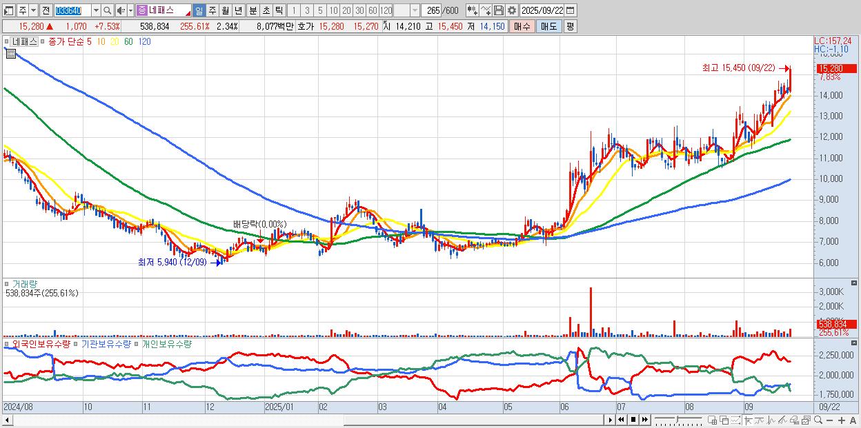 - 네패스 (15,220원 ▲ 7.11% , 시총: 3,510억, 거래량: 317,699, 거래대금:48억, KOSDAQ)