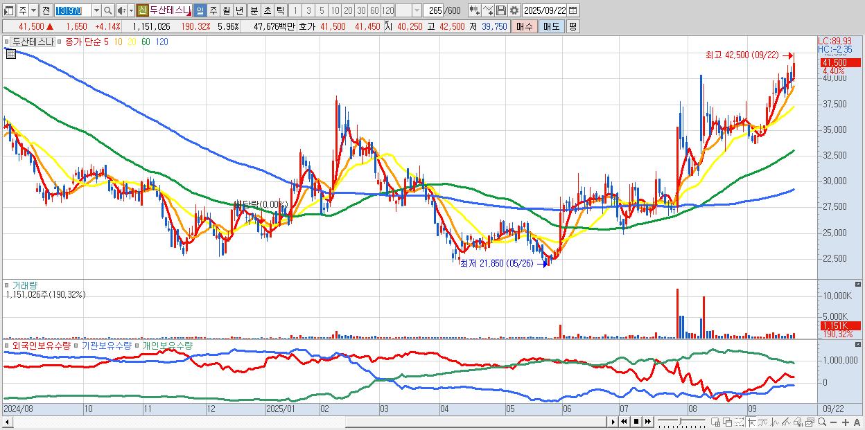 - 두산테스나 (41,400원 ▲ 3.89% , 시총: 8,001억, 거래량: 612,667, 거래대금:254억, KOSDAQ)
