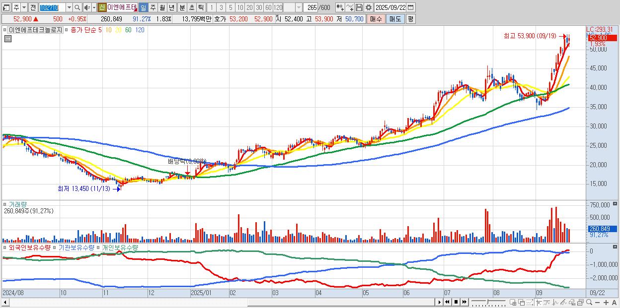 - 이엔에프테크놀로지 (53,600원 ▲ 2.29% , 시총: 7,658억, 거래량: 186,814, 거래대금:99억, KOSDAQ)
