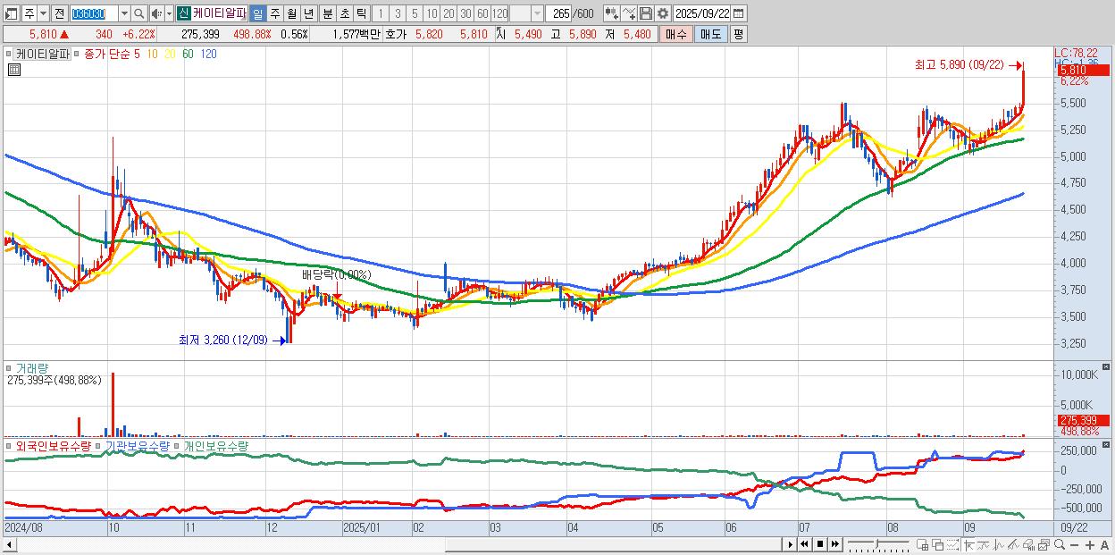 - 케이티알파 (5,810원 ▲ 6.22% , 시총: 2,848억, 거래량: 275,399, 거래대금:16억, KOSDAQ)