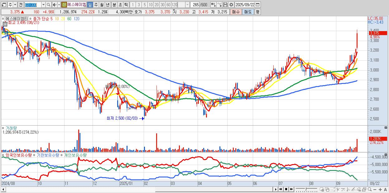 - 에스에이엠티 (3,375원 ▲ 4.98% , 시총: 3,375억, 거래량: 1,286,974, 거래대금:43억, KOSDAQ)