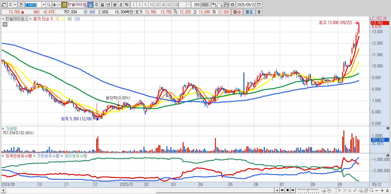 - 한솔아이원스 (13,760원 ▲ 6.67% , 시총: 3,934억, 거래량: 757,834, 거래대금:103억, KOSDAQ)