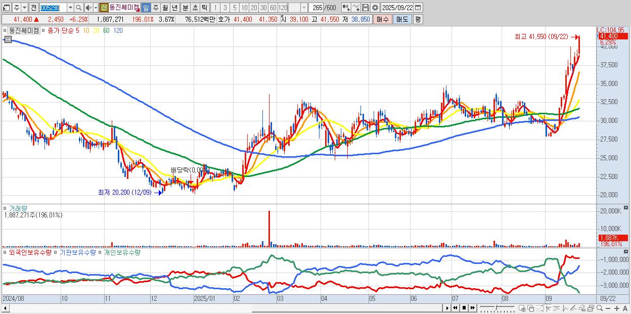 - 동진쎄미켐 (41,350원 ▲ 6.16% , 시총: 21,260억, 거래량: 1,153,979, 거래대금:468억, KOSDAQ)