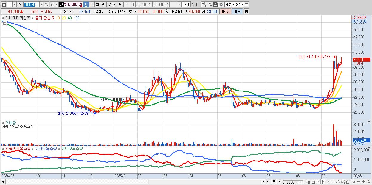 - 하나머티리얼즈 (40,050원 ▲ 1.78% , 시총: 7,921억, 거래량: 408,485, 거래대금:163억, KOSDAQ)