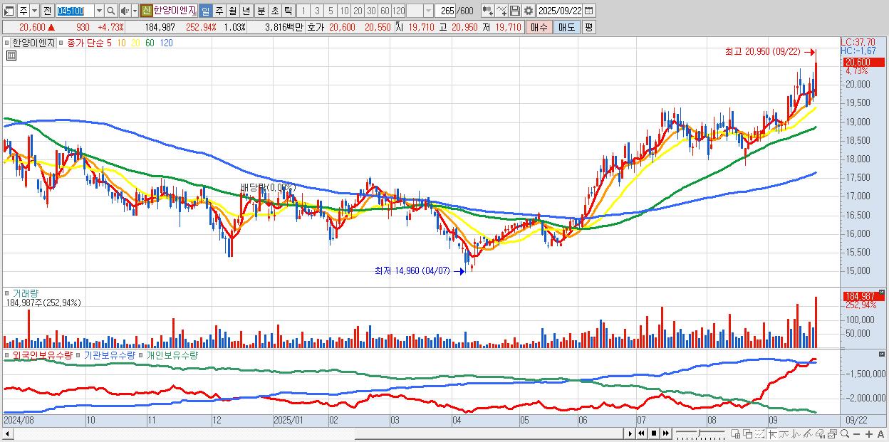 - 한양이엔지 (20,600원 ▲ 4.73% , 시총: 3,708억, 거래량: 184,987, 거래대금:38억, KOSDAQ)