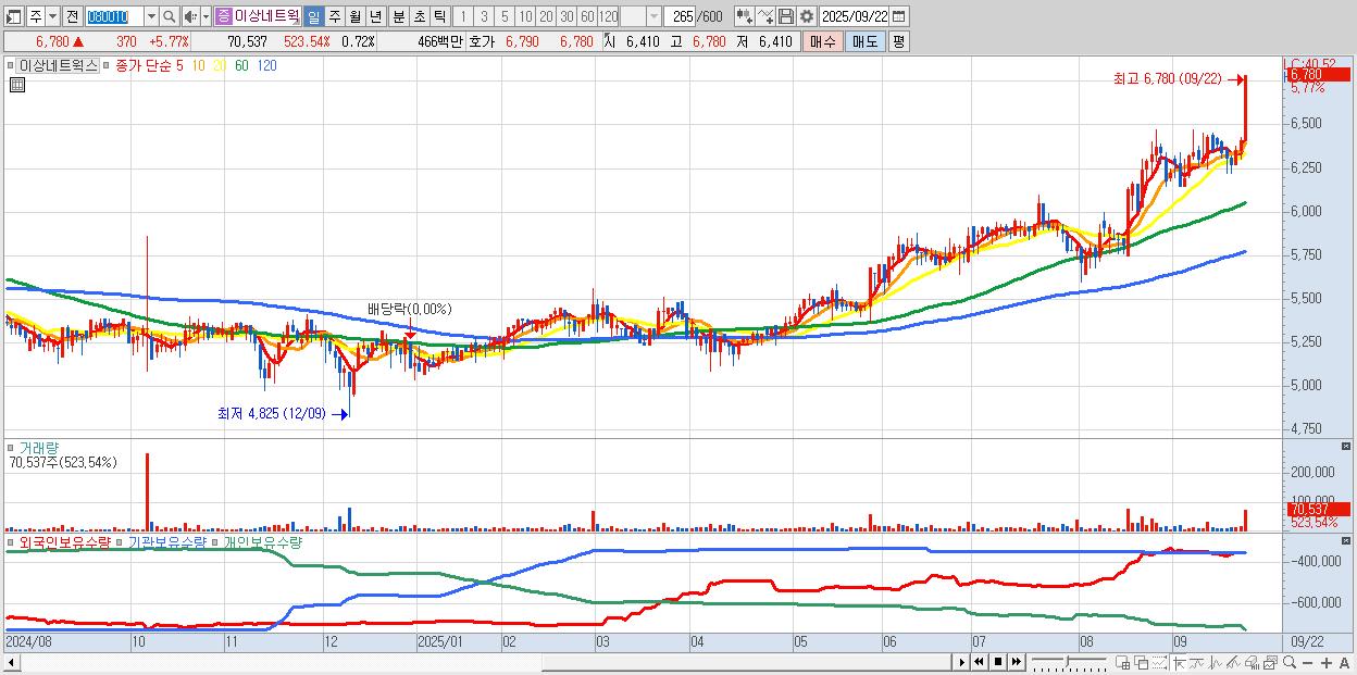 - 이상네트웍스 (6,780원 ▲ 5.77% , 시총: 667억, 거래량: 70,537, 거래대금:5억, KOSDAQ)