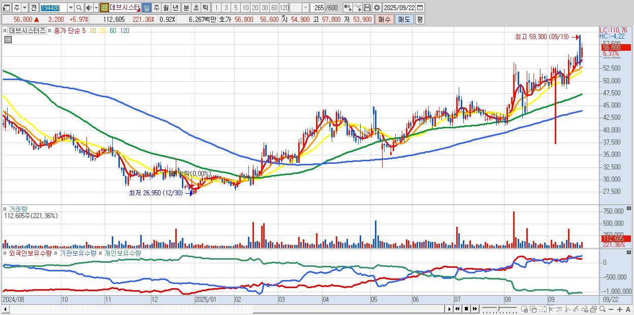 - 데브시스터즈 (56,400원 ▲ 5.22% , 시총: 6,883억, 거래량: 74,579, 거래대금:41억, KOSDAQ)