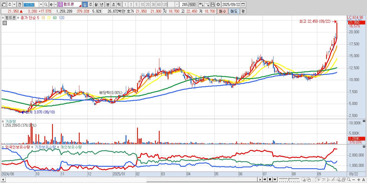 - 펨트론 (21,900원 ▲ 17.3% , 시총: 4,662억, 거래량: 849,188, 거래대금:180억, KOSDAQ)