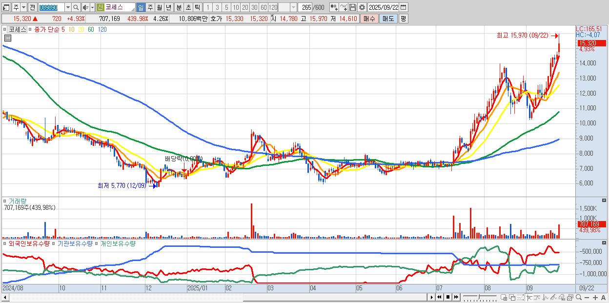 - 코세스 (15,320원 ▲ 4.93% , 시총: 2,541억, 거래량: 707,169, 거래대금:108억, KOSDAQ)