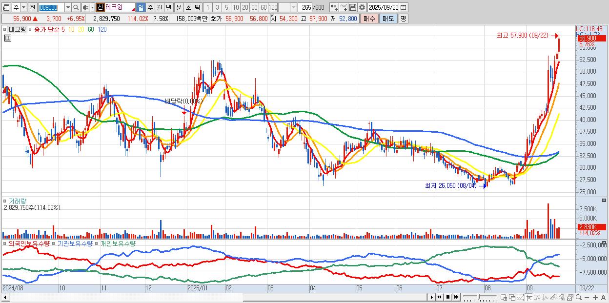 - 테크윙 (56,900원 ▲ 6.95% , 시총: 21,254억, 거래량: 1,450,810, 거래대금:812억, KOSDAQ)
