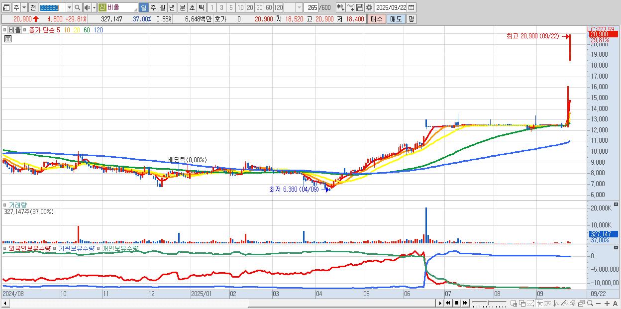 - 비올 (20,900원 ▲ 29.81% , 시총: 12,210억, 거래량: 327,147, 거래대금:66억, KOSDAQ)