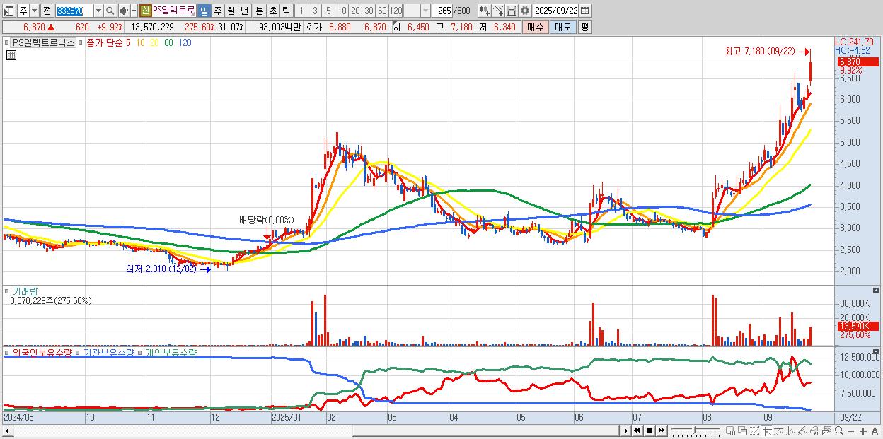 - PS일렉트로닉스 (6,870원 ▲ 9.92% , 시총: 3,000억, 거래량: 13,570,229, 거래대금:930억, KOSDAQ)