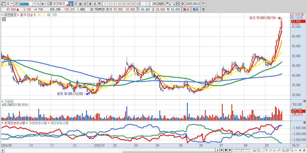 - 유진테크 (67,700원 ▲ 4.64% , 시총: 15,514억, 거래량: 321,155, 거래대금:217억, KOSDAQ)