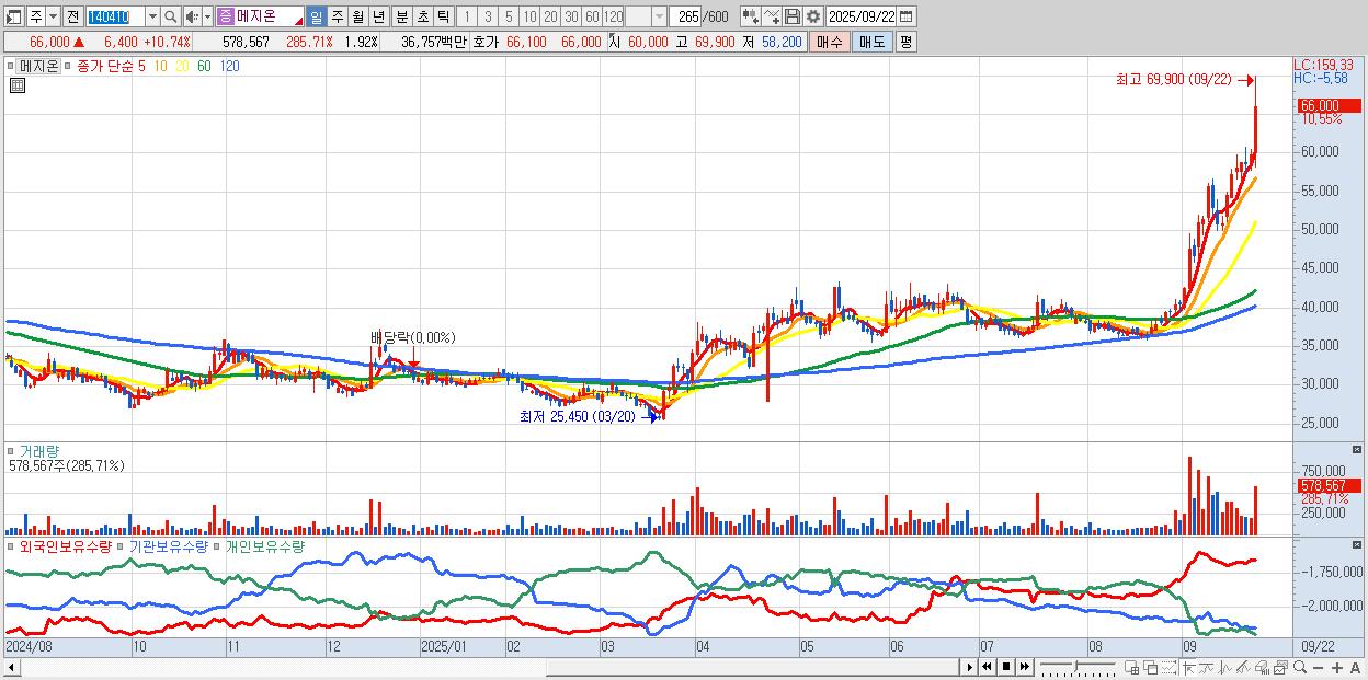 - 메지온 (66,400원 ▲ 11.41% , 시총: 19,996억, 거래량: 332,501, 거래대금:210억, KOSDAQ)