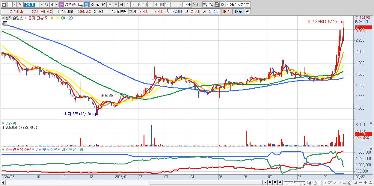 - 심텍홀딩스 (2,430원 ▲ 9.95% , 시총: 1,224억, 거래량: 1,705,061, 거래대금:42억, KOSDAQ)